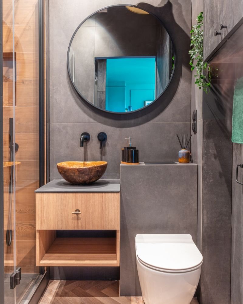 ✔ Introduce wood tones, warm lighting, plush towels, and cozy textures to create an inviting atmosphere.